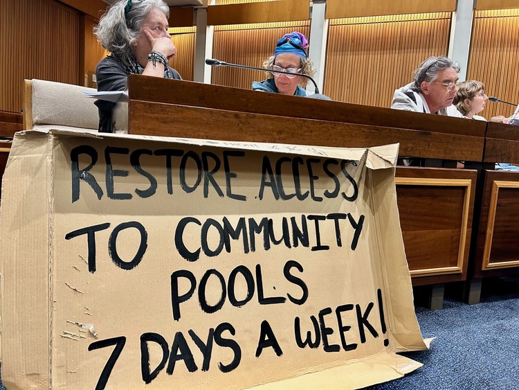 Dressed in swimming caps and goggles, community members took their protest to the City’s budget public participation meeting.