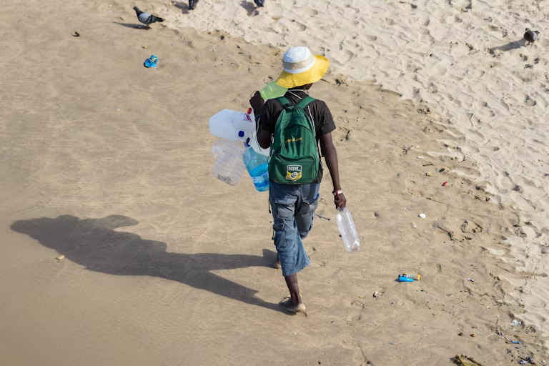 Collecting plastic bottles on a beach in South Africa. iStock Editorial / Getty Images Plus